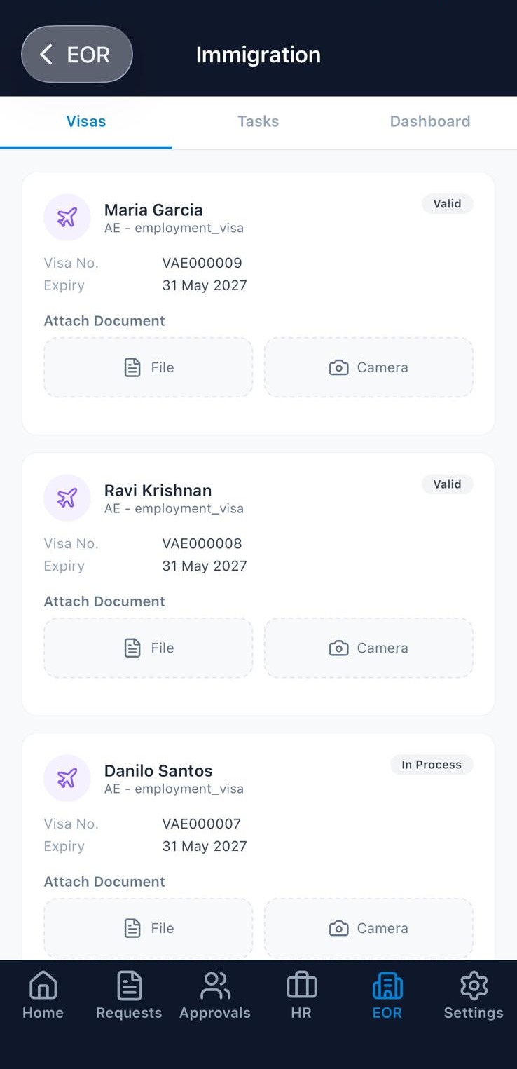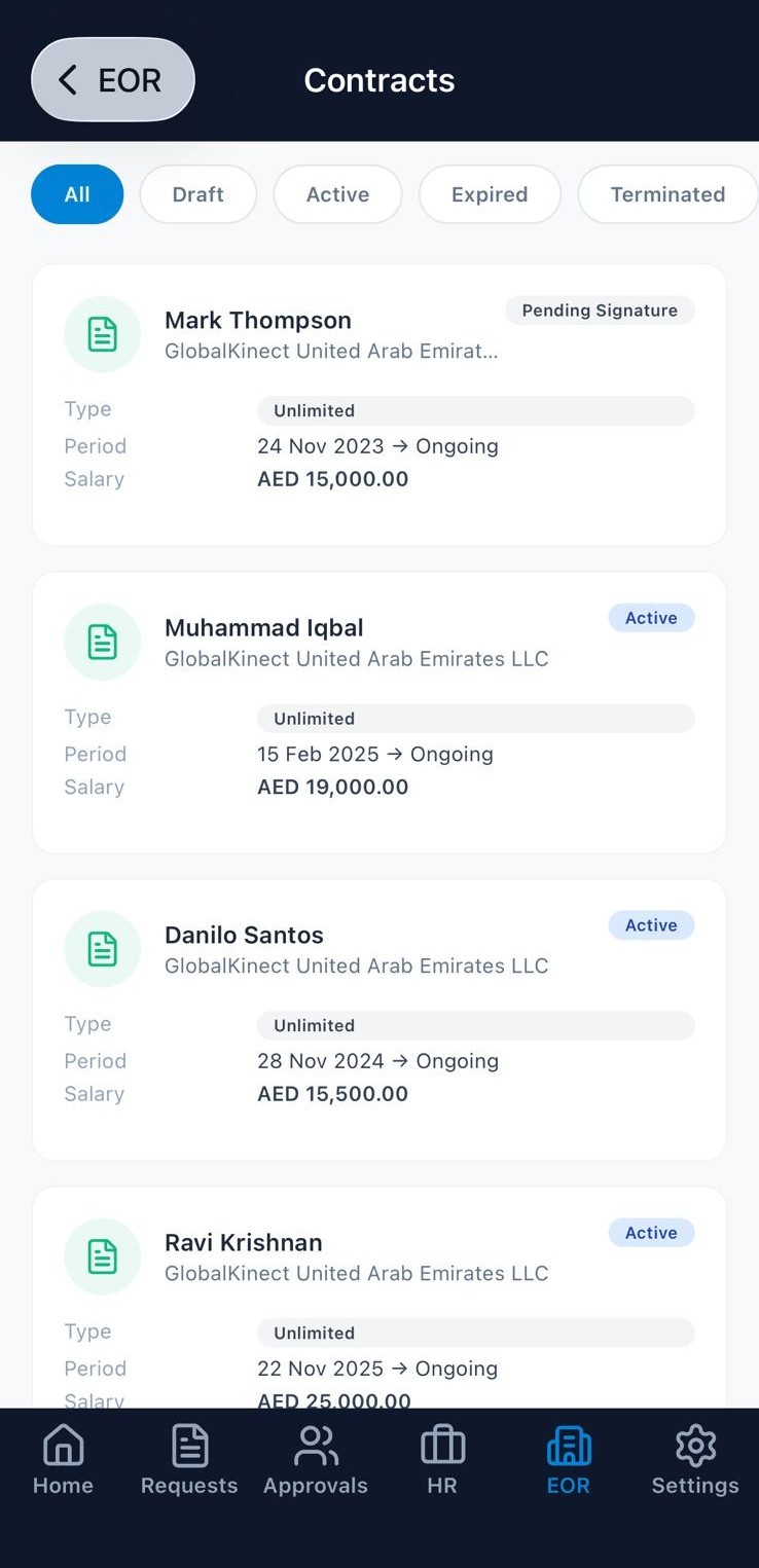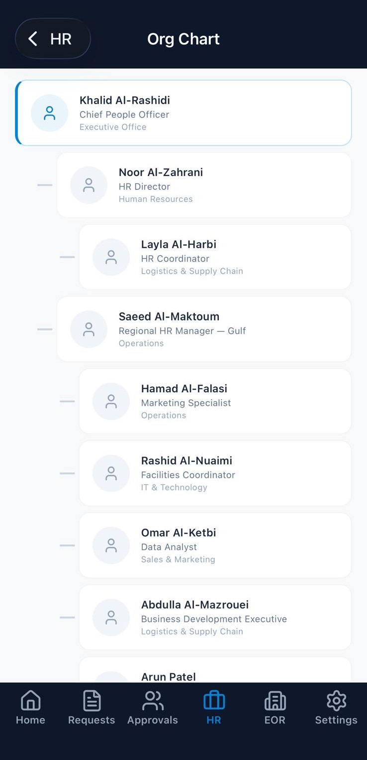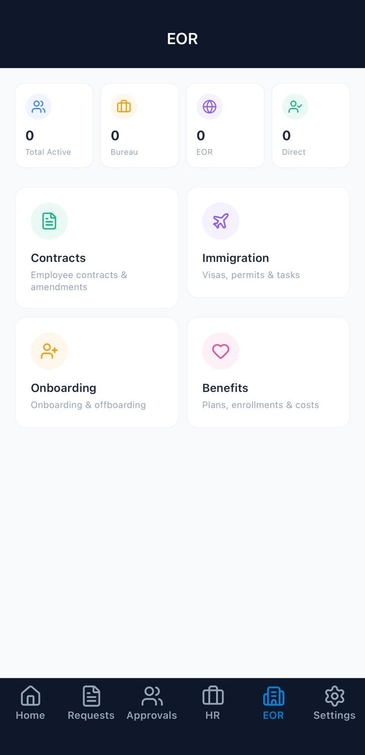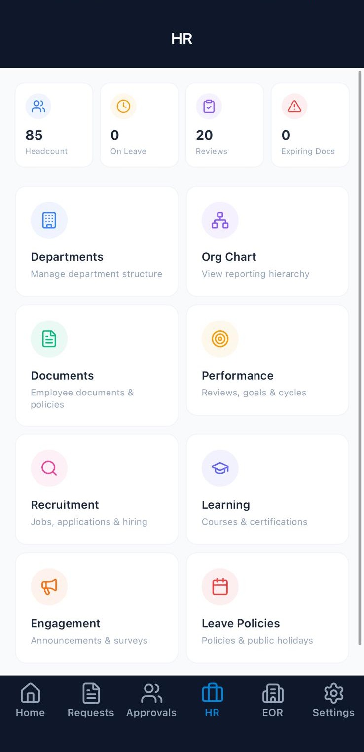 HR, EOR, recruitment, org charts, immigration, contracts — everything available on the desktop platform is accessible from the app. Not a simplified version. The real thing.