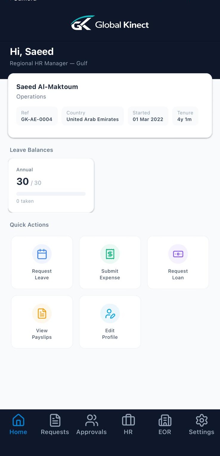 The Global Kinect app is a native iOS and Android mobile app that gives employees and managers access to the full platform from their phone. Employees view payslips, request leave, submit expenses, and check in via QR attendance. Managers approve requests with one tap. Biometric login, push notifications, and offline capability come as standard.