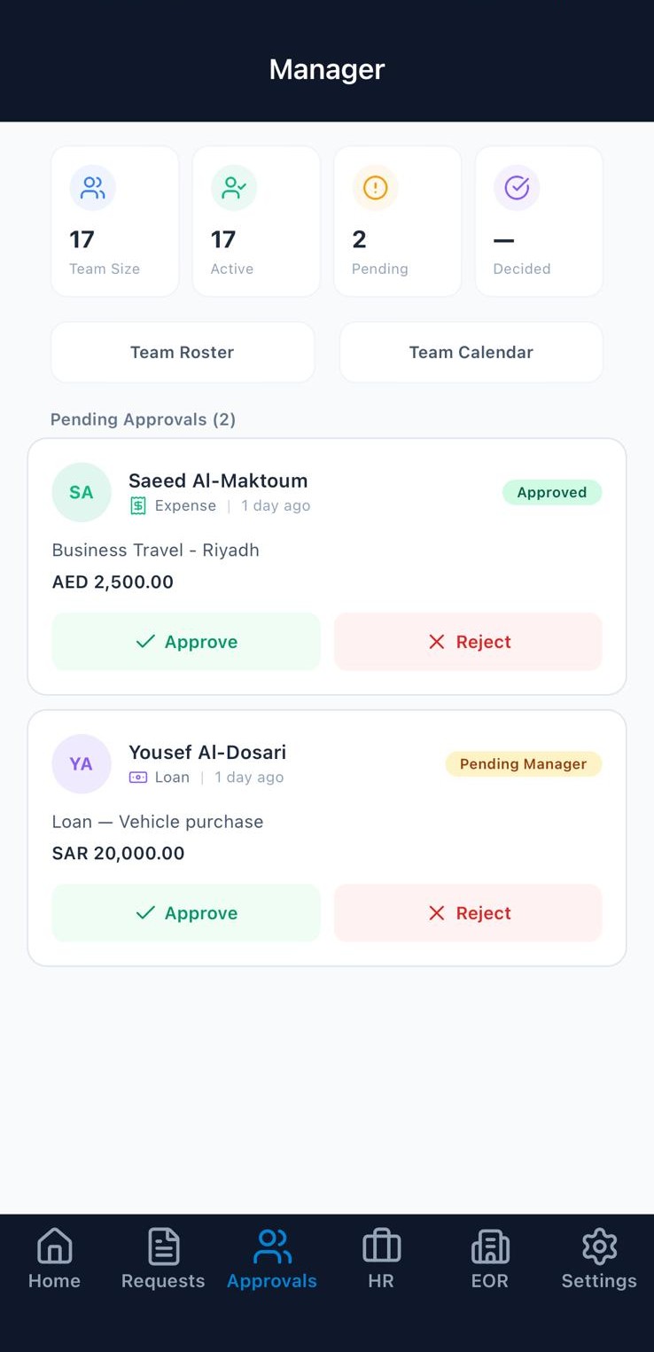 Leave, expenses, loans, timesheets — approve or reject with one tap. No login to a desktop portal.
