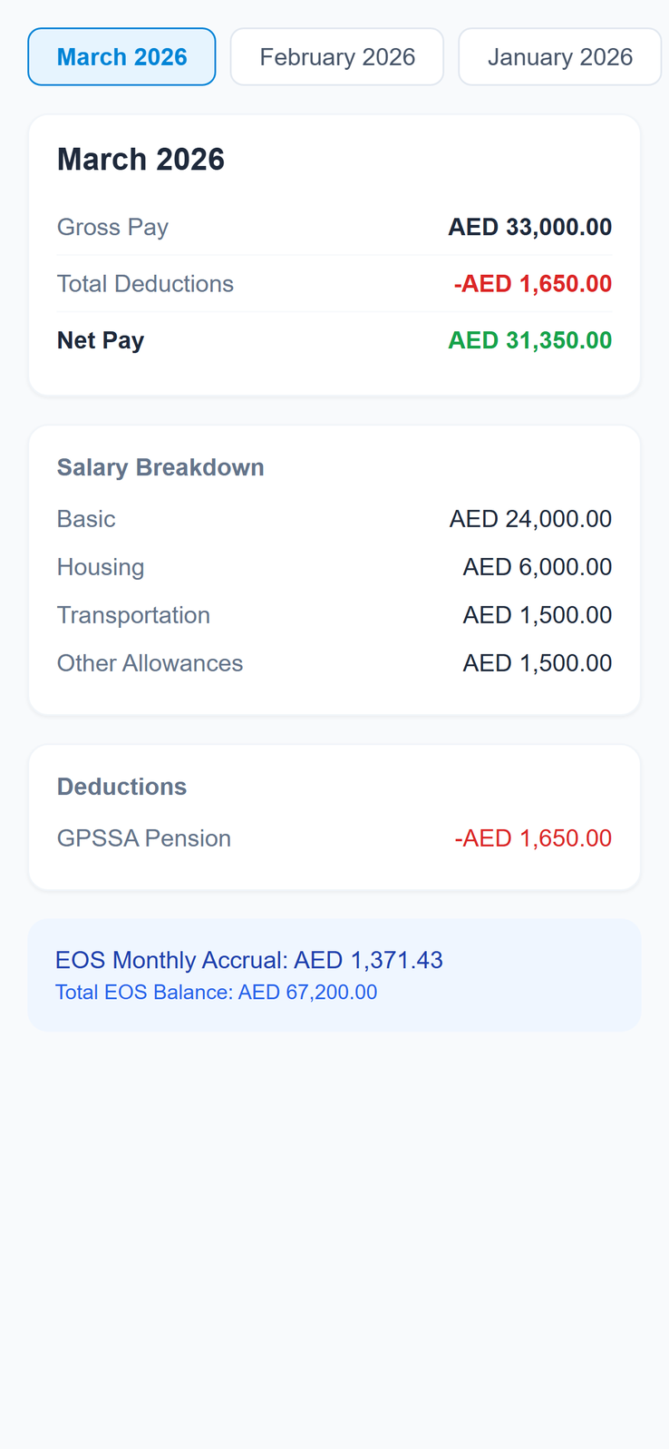 Full salary breakdown, deductions, and net pay — downloadable every month.